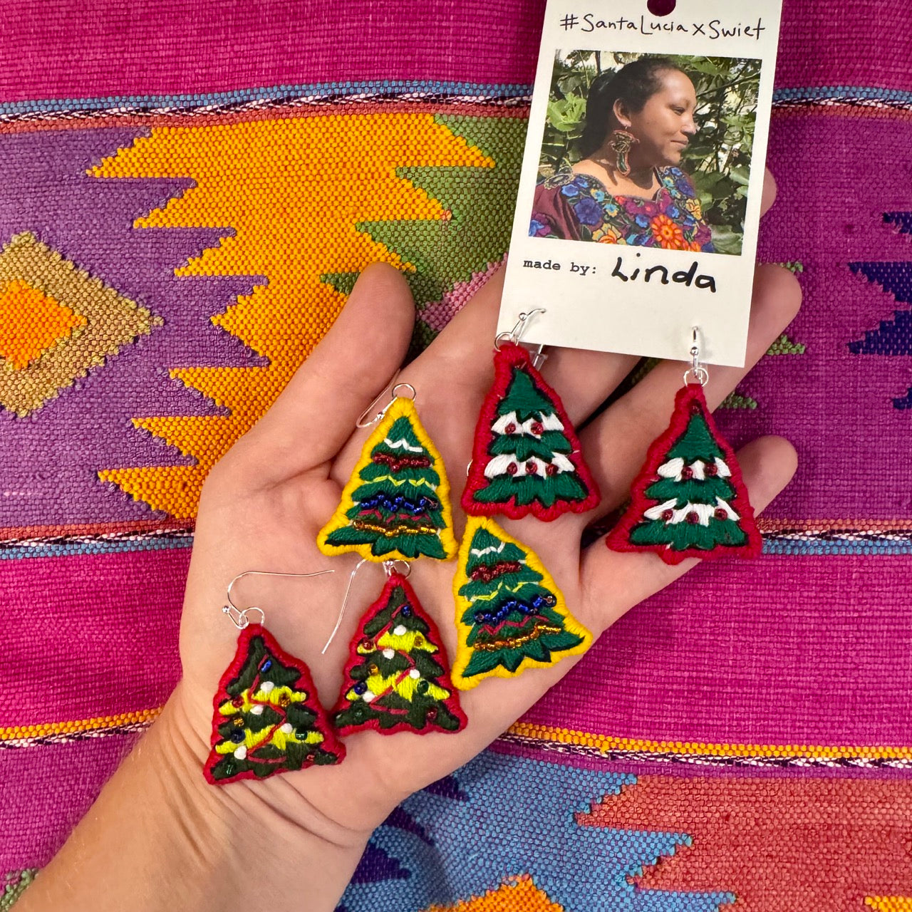Super light-weight embroidered CHRISTMAS TREE earrings handmade in Guatemala.
